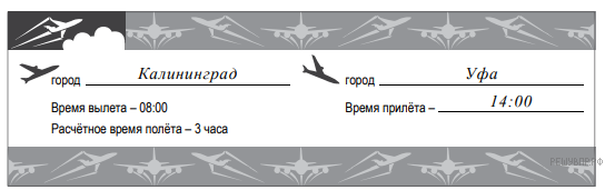 Из точки А в точку Б туристы решили добраться на самолёте. Заполните пропуски в авиабилете: впишите названия пункта вылета, пункта назначения и время прилёта в пункт назначения (местное время).