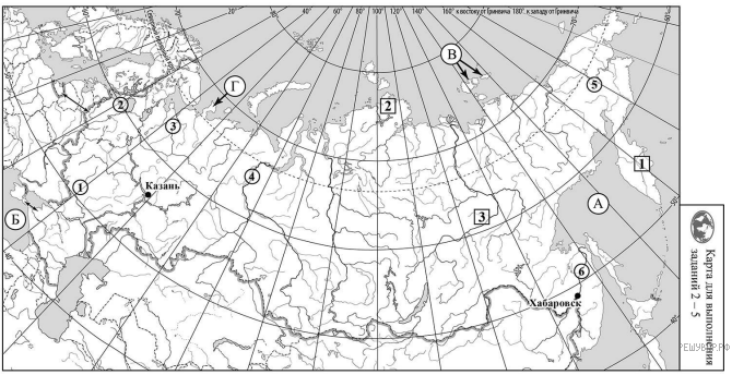На карте буквами обозначены объекты, определяющие географическое положение России. Выберите из приведённого списка названия этих объектов и запишите их в таблицу.