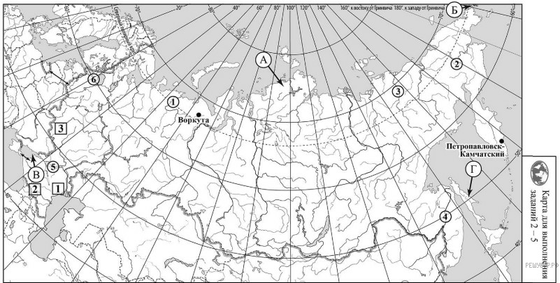На карте буквами обозначены объекты, определяющие географическое положение России. Выберите из приведённого списка названия этих объектов и запишите их в таблицу.